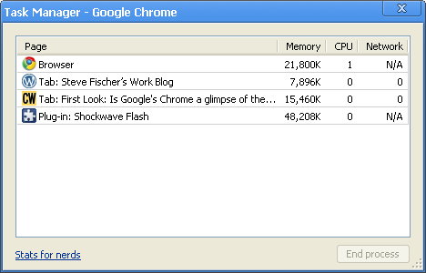 There’s even a Chrome version of Task Manager showing all the tabs (and damn, Flash takes a lot of memory).