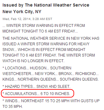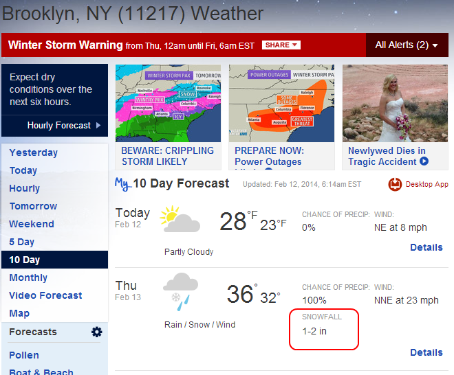 Weather.com this morning for Brooklyn. Note tomorrow’s snowfall forecast.
