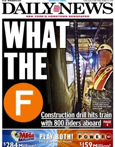 It made for a good tabloid cover page, but it sure looked scary. A huge construction drill goes in the wrong place and nearly pierces a subway car (on the F line – hence the cover below). Thankfully, no one was hurt.
