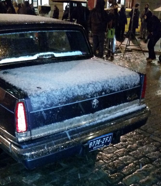 So that’s where they were filming. The attention to detail is interesting. They put up some fake store signs and other little touches. The had a bunch of old cars with Gotham license plates.
