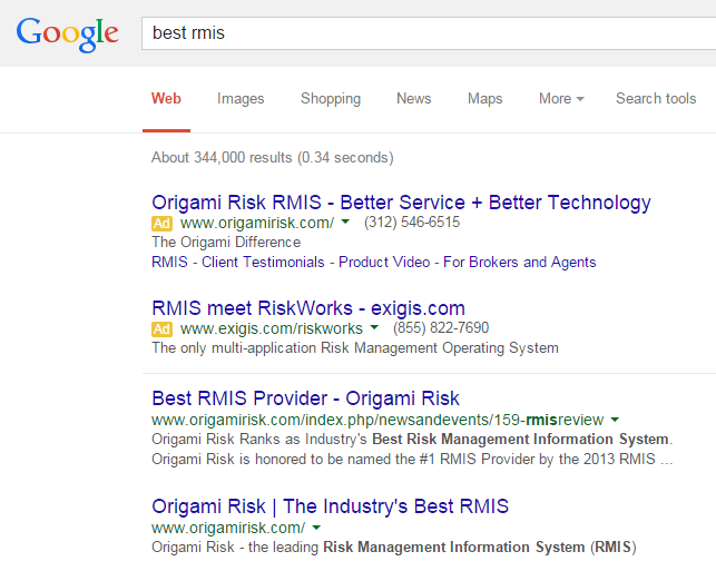 Search engines, however, are neutral. Here are the top results from various searches on “best RMIS” (for some searches, ads are at the top):