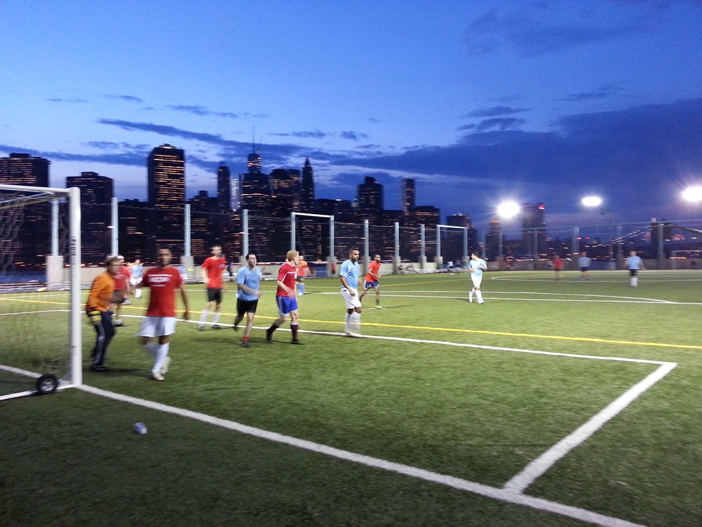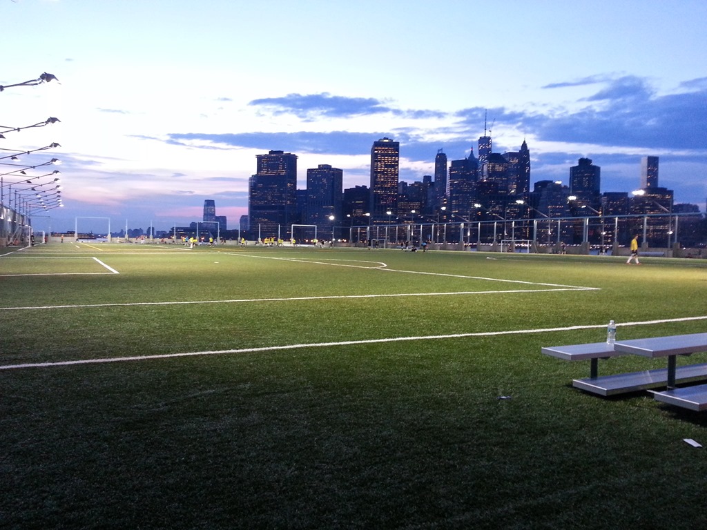 But the setting is fantastic. As part of the continued expansion of Brooklyn Bridge Park, Pier 5 has been built out with three nice turf soccer fields. On a nice summer night, it’s a great place to watch a soccer game.