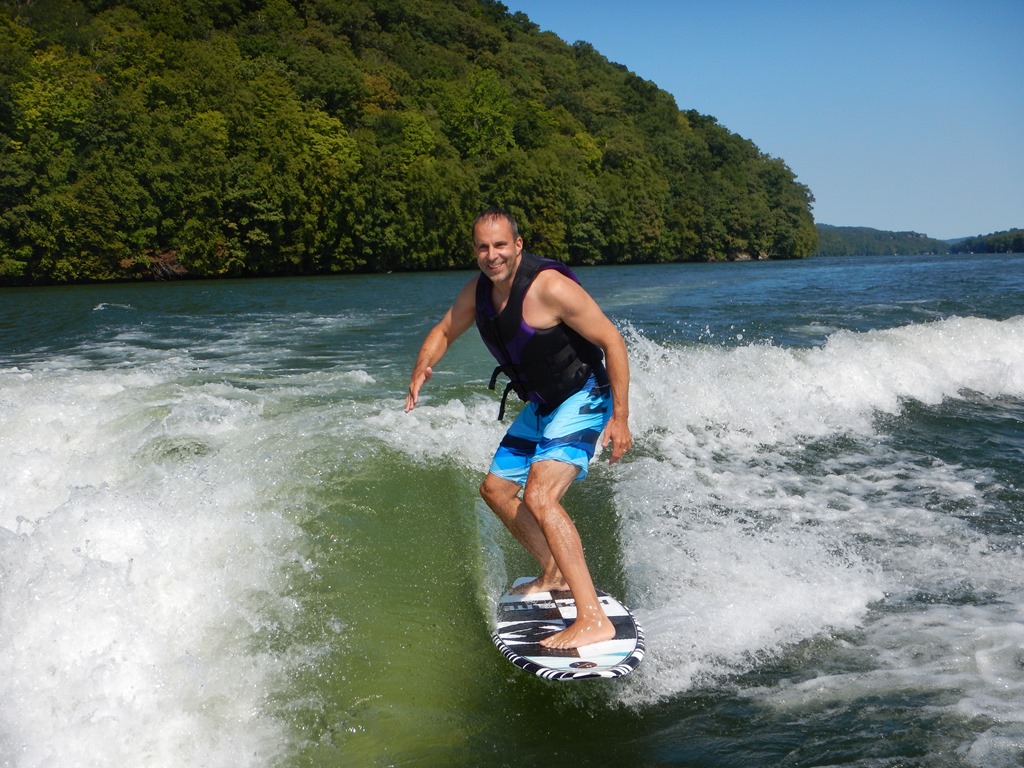 Over Labor Day weekend we got to go to our friend’s lake house in Connecticut. It’s on Candlewood Lake, which is the biggest lake in Connecticut and quite beautiful. And this summer they got a boat for wake surfing. If you aren’t familiar with wake surfing, the boat is specially designed to produce wake in the shape of a continuous wave. The back of the boat has large ballast tanks that fill with water to add weight and there’s some mechanism to direct the wave (it can be either on the left or right depending on the surfer). The boat goes quite slowly compared to water skiing (10 – 12 mph) and you surf fairly close to the boat, since you need the wave it is producing. You are initially pulled up with a rope, but once you get good you can throw the rope back to the boat and simply surf the wave.