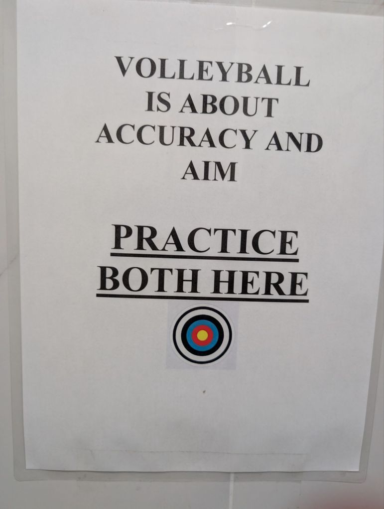 I was at an indoor beach volleyball venue where my daughter was playing, and in the men’s bathroom above the toilet I saw this: